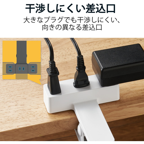 ●机などに挟んで利用することができるクリップ機構を搭載した2ピン式の3個口タップです。