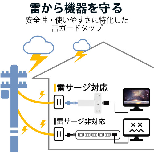 エレコム T-KF03-2325WH クリップタップ 雷サージ付 ホコリシャッター付 3個口 スイングプラグ 2.5m ホワイト