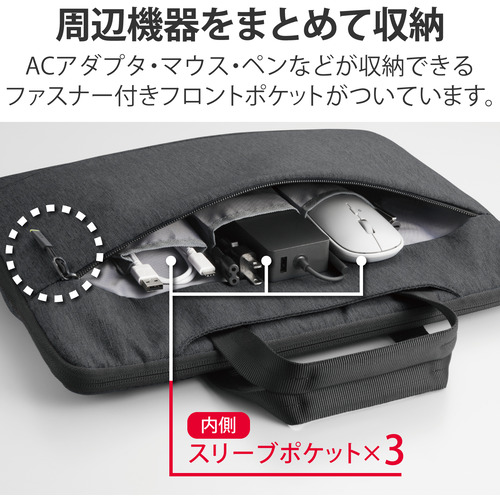 ●ACアダプタ・マウス・ペンなどの周辺機器をまとめて収納できるフロントポケットがついています。ポケット内部には、収納物の整理に便利なスリーブポケットを備えています。
