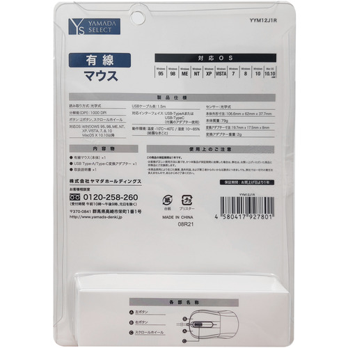YAMADA SELECT YYM12J1 有線マウス レッド