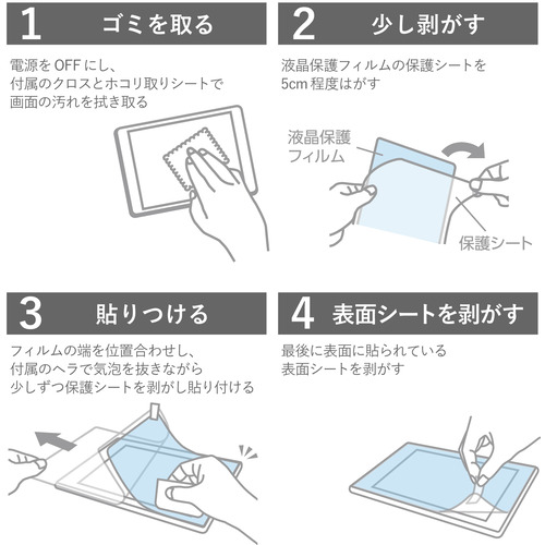セット内容:液晶保護フィルム(エアーレス防指紋高光沢仕様)×1、ホコリ取りシール×1、クリーニングクロス×1、ヘラ×1