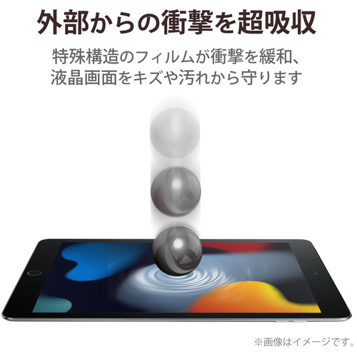 ●マルチPET構造が衝撃を吸収し、液晶画面を保護するブルーライトカットタイプのiPad 第9世代(2021年モデル)、iPad 10.2インチ 2020年モデル、iPad 10.2インチ 2019年モデル用衝撃吸収フィルムです。