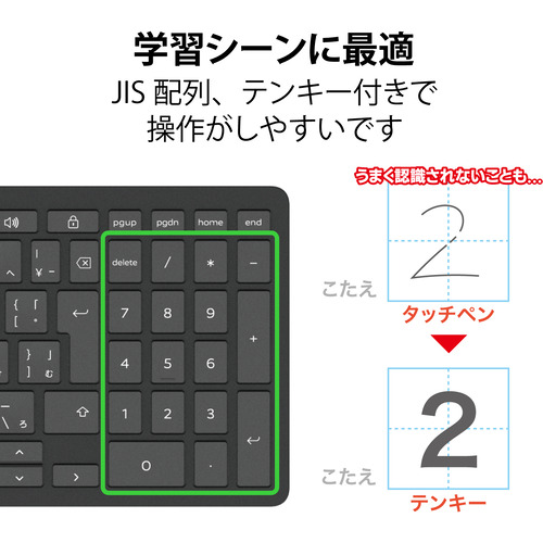 数字入力に便利なテンキー付きで、グラフ作成や計算など、表計算ツールの入力作業がはかどります。