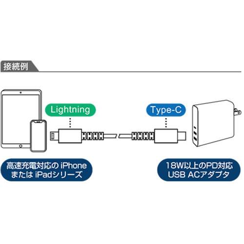 USB PDに対応したUSB ACアダプタとあわせて使用することで、高速充電対応のiPhone・iPadをより高速で安全に充電することが可能に。