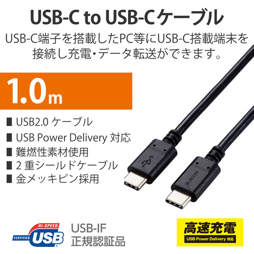 エレコム U2C-CC5PC10NBK USB2.0ケーブル C-Cタイプ 認証品 USB Power Delivery対応 5A出力 100W コンパクトコネクタ 1.0m ブラック