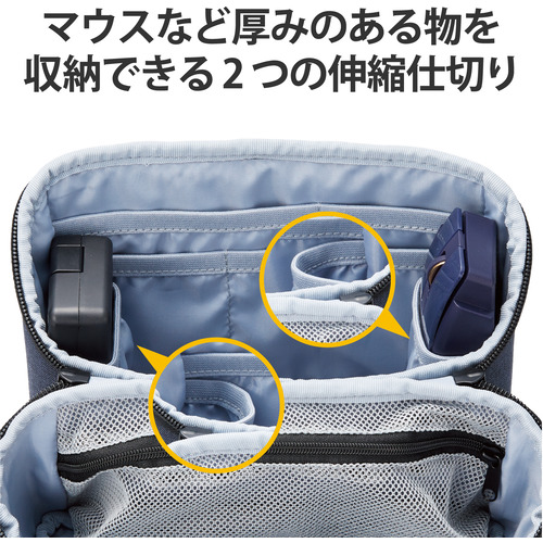 ●マウスなど厚みのある収納物にもフレキシブルに対応する2つの伸縮仕切りを備えています。