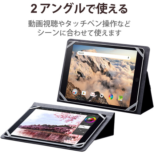 ●タッチペンを使用して操作や視聴に便利な2アングルタイプのスタンド機能付! 8.5〜11.5インチのタブレットに対応し、高級感のあるソフトレザーを使用した手帳タイプの汎用タブレットケースです。