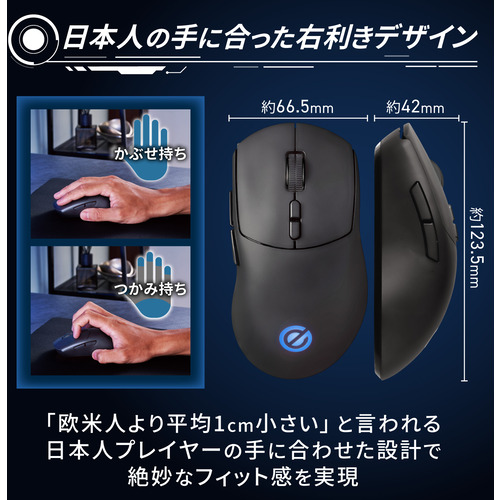 ●かぶせ持ち、つかみ持ちと「その中間」までカバーし、右利きに最適化された左右非対称形状のガンシューティング系ゲーム(FPS)向けゲーミングマウスです。