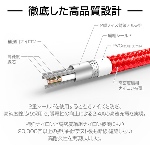 強靭タイプの高密度編み込み線を使用することにより、ケーブルの強さと柔らかさを両立し、断線に対して、従来の商品と比べても格段に強くなってます。