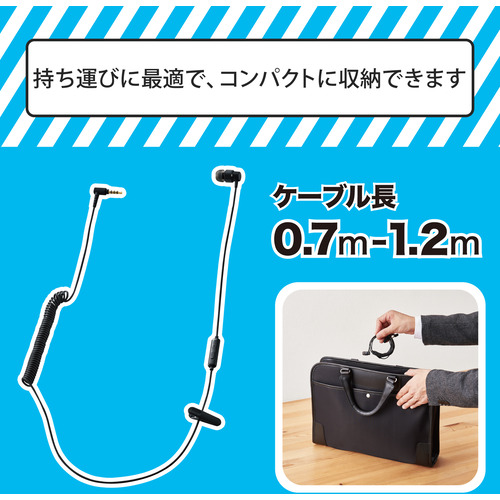 カールコードのためケーブルに伸縮性があり取り回しが快適かつ、絡まりにくいため持ち運びにも最適で、コンパクトに収納することができます。
