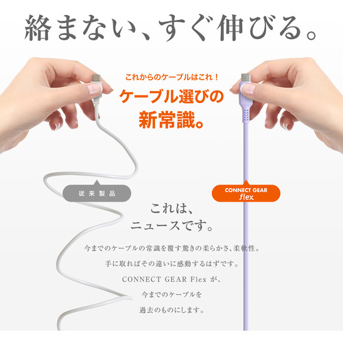 一般的なケーブルはビニール被覆を使用していますが、本製品はシリコンラバーで被覆することにより、折り癖、 巻き癖がつかず、 絡まずすぐ解ける驚きの柔らかさを実現しました。