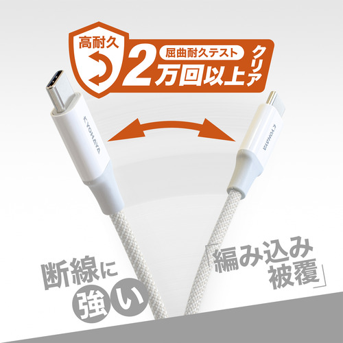断線に強い編み込み被覆を採用することで、屈曲耐久テストを2万回以上クリアする、高耐久性を実現した、USB A to USB Type-C ケーブルです。