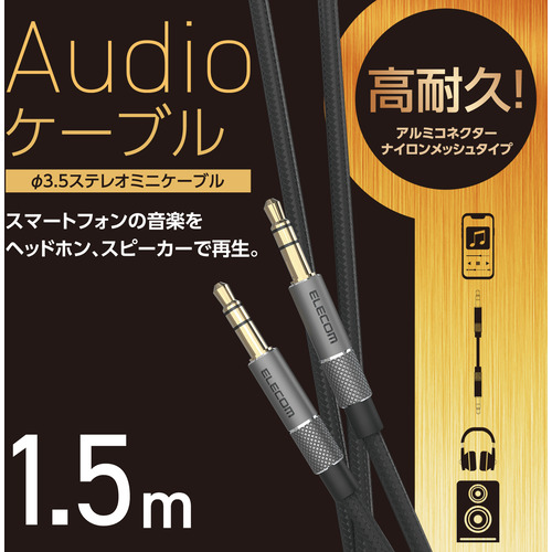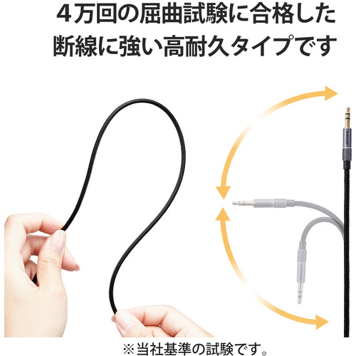 ●音楽プレーヤーやスマートフォンの音楽をヘッドホンやスピーカーで再生することが可能なφ3.5mmステレオミニケーブルです。断線に強い高耐久のアルミコネクター・ナイロン編組ケーブルを採用しており、4万回の屈曲試験(当社基準)に合格しています。