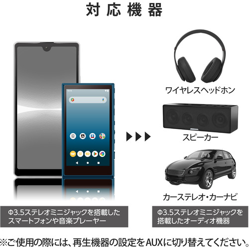 対応機種:φ3.5mmステレオミニジャック搭載のスピーカー・ヘッドホン・カーナビ・カーステレオおよびφ3.5mmステレオミニジャック搭載のスマートフォン・ポータブルオーディオプレーヤーなど