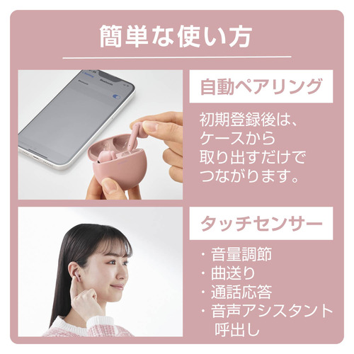 ●装着時も収納時もコンパクトなBluetooth(R)完全ワイヤレスステレオヘッドホン。耳への負担が少なく、周囲の音や話し声が聞き取りやすいセミオープンタイプです。ミニマムなサイズ感・超軽量設計でスマートに持ち運べるデザインです。