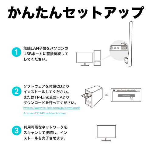 付属品:AC600 ハイパワー デュアルバンド無線LAN子機 Archer T2U Plus、かんたん設定ガイド、リソースCD