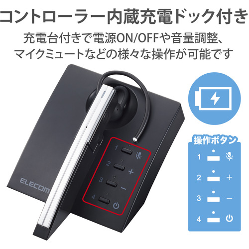 充電台にはヘッドセットの操作ボタンを搭載しており、電源のオンオフや音量調整など様々な操作が充電台で行えるBluetooth(R)ハンズフリーヘッドセット。