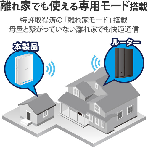 ●母屋と繋がっていない離れ家との通信は「屋外利用」として扱われるため、屋外利用禁止の電波も使う従来品や他社製品では電波法違反になる可能性がありましたが、本製品は屋外利用が認められた電波帯域のみで動作する「離れ家モード(特許取得済み)」を搭載しているので、同環境でも安心してお使いいただけます。