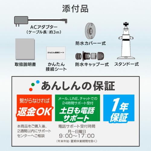 付属品:防水カバー一式、防水キャップ一式、ACアダプター(ケーブル長:約3m)、スタンド一式、取扱説明書、かんたん接続シート