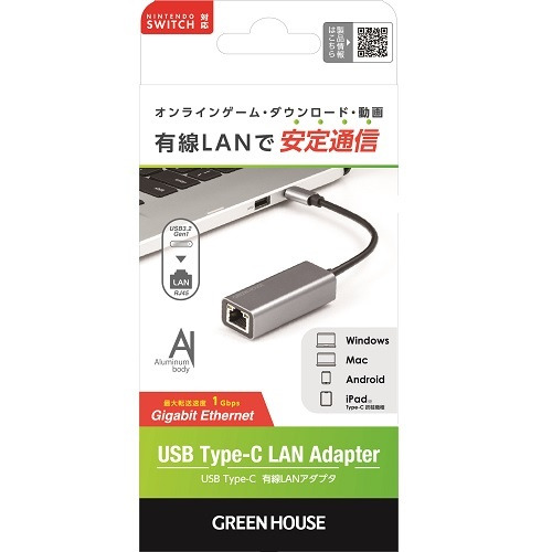 グリーンハウス GH-ULACB-GY USB Type-C LAN変換アダプタ Gigabit対応 Chrome/Android/iPadOS/Mac/Windows対応 グレー