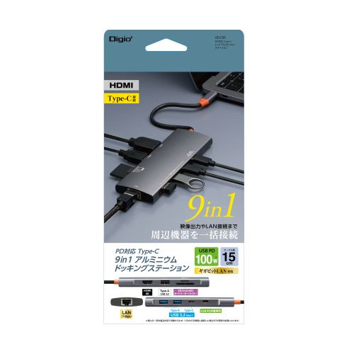 ナカバヤシ UD-C05GY PD対応 Type-C 9in1 アルミドッキングステーション グレー