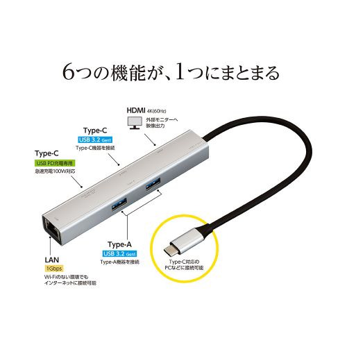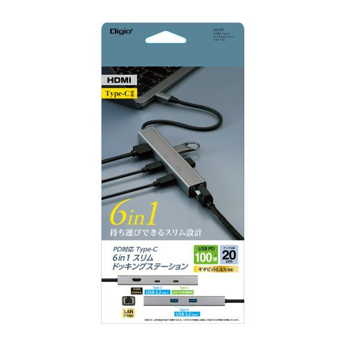 ナカバヤシ UD-C07GY PD対応 Type-C 6in1 スリムドッキングステーション グレー