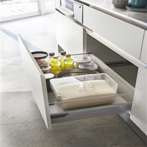 ●システムキッチンの引き出しに合うスタイリッシュな米びつ。パッキンでしっかり密閉され、お米が最後まできれいにすくえます。蓋をパチッとロックしておけば、お米を湿気と酸化から防いでくれます。炊飯器の横に置いておけば作業もスムーズ。蓋は全面が開くからお米がすくいやすく、残量が分かりやすい透明蓋。底の形が付属の計量カップにピッタリとフィットするから、残りのお米をきれいにすくい取ってくれます。