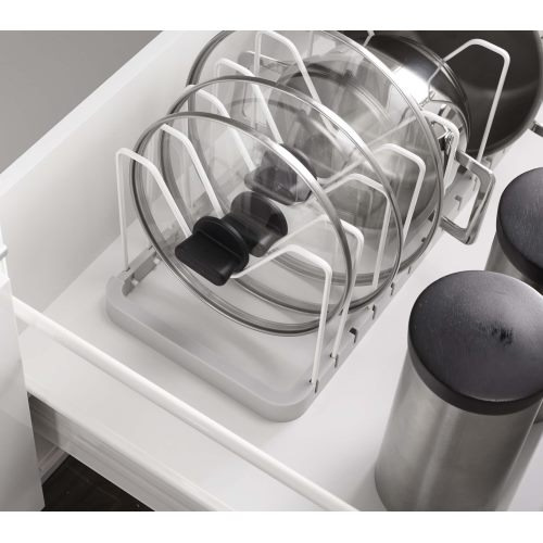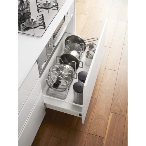 ●伸縮できるからシンク下のスペースに合わせてピッタリフィットするフライパン&鍋蓋スタンド!鍋やフライパンのサイズに合わせて仕切りパーツの位置は3cmごとに調整可能。持ち手が上になるから取り出しやすい持ち手置き付き!下に空いたスペースができるから収納力もアップします。