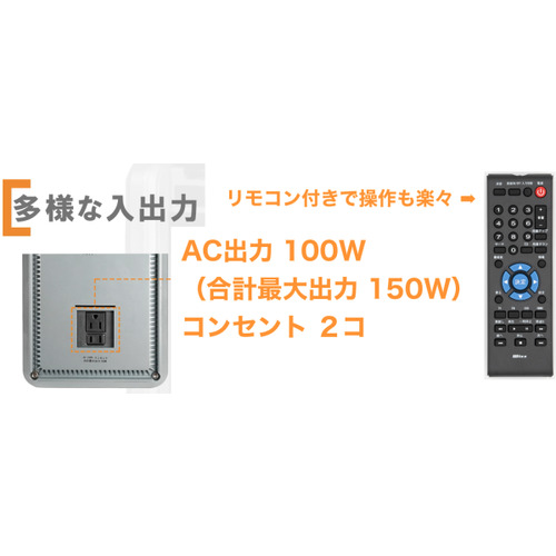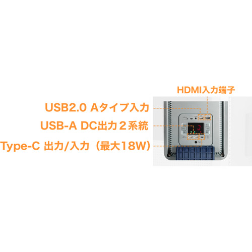 AC 100Vコンセント ×2(最大150W)、PD18W対応 Type-C ×1、USB-A出力 ×2、HDMI入力 ×1、USB入力 ×1(ファイル再生用)