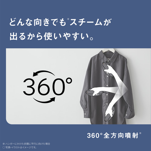 スチーム量 平均 約13g/分。パワフルな浸透スチームが繊維の奥までしっかり届き、衣類をケア。さらに、360°全方向に噴射(※ハンガーにかけた衣類に平行に向けた場合※)するからどんな向きでも使える。
