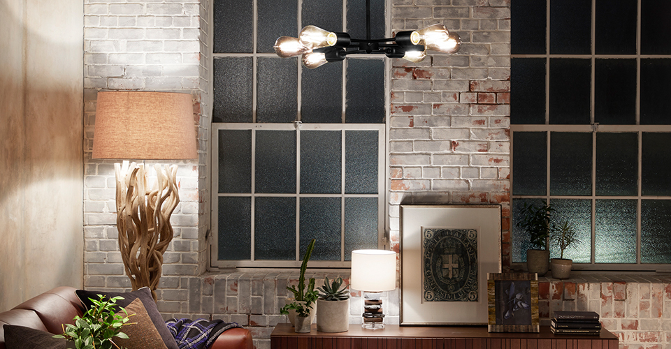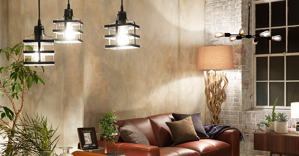 マットブラック色に仕上げられたアイアンパーツと別色の白熱灯を模したクリアLED電球の組み合わせが、インダストリアルテイストを演出。