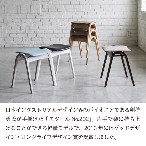 日本インダストリアルデザイン界の先駆者である剣持勇氏が手掛けたスツール「No.202」。シンプルな美しさと機能性を兼ね備え、1958年に発表されて以来のロングセラーモデルです。2013年にはグッドデザイン・ロングライフデザイン賞を受賞しました。