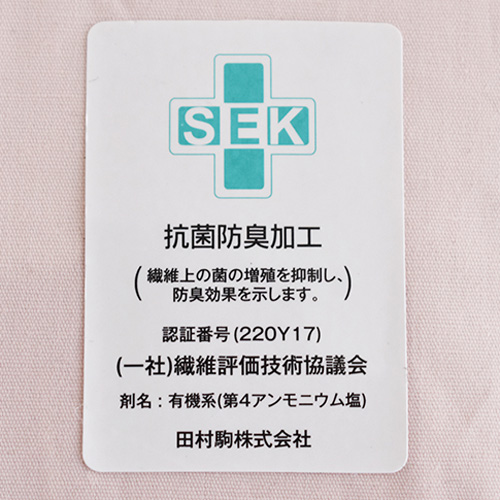 抗菌防臭加工を施したシンプルなボックスシーツです。一般社団法人繊維評価技術協議会に認証されたSEKマーク(抗菌防臭加工)付き。