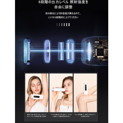 1cm2あたり最大5.3j/cm3のハイパワー、出力調整6段階で体の部位によって調整可能で痛みを感じにくい。
