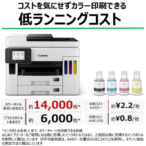 インクボトル各色1本でエコノミーモードならブラック約9000枚、カラー約21000枚印刷可能