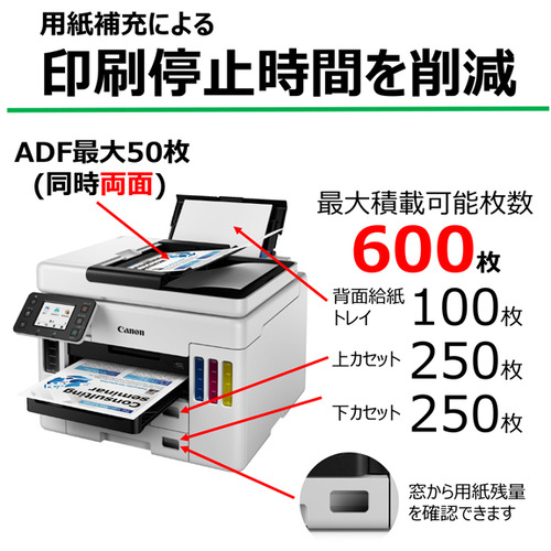 特大容量インクタンクや大容量給紙、セルフメンテナンス仕様により印刷停止時間を削減。