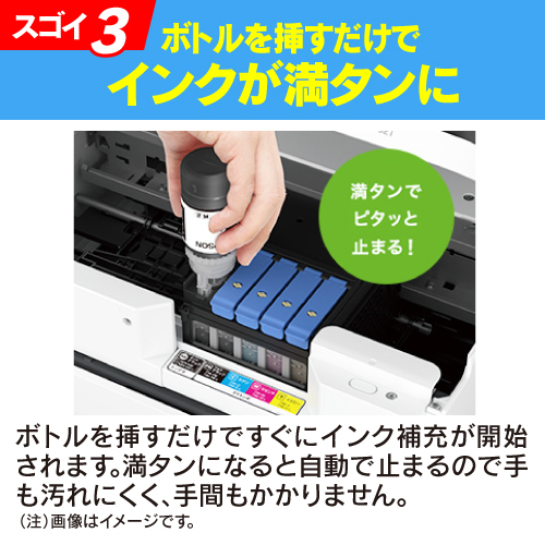 インク補充の案内が出てからちょうど1回補充できる「使い切りサイズ」では、A4カラー文書を約1,000ページ、複数回補充可能な「増量サイズ」では、約3,700ページプリント可能。