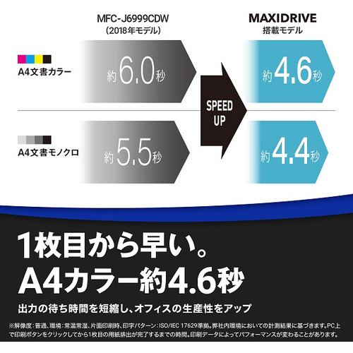さらに1枚目の印刷時間がカラー約4.6秒、モノクロ約4.4秒と大幅に高速化。出力の待ち時間を短縮し、ストレスなく印刷することができます。