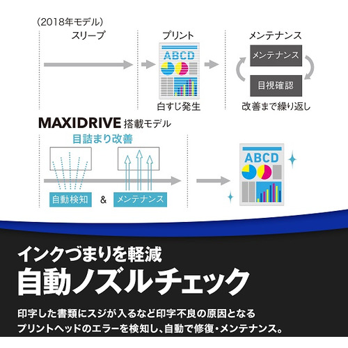 印字した書類にスジが入るなど印字不良の原因となるプリントヘッドのエラーを検知し、自動で修復・メンテナンスを行います。