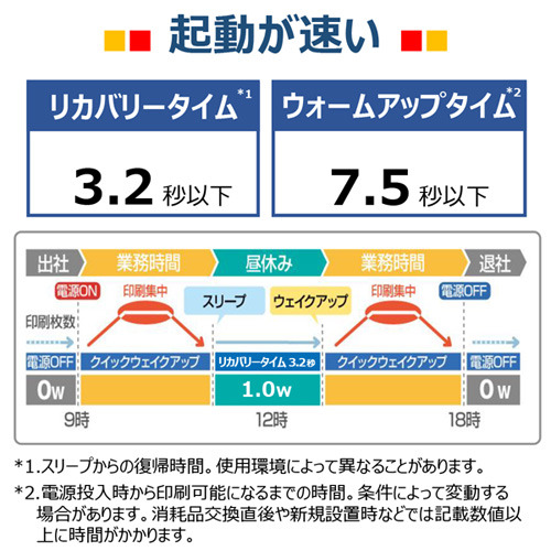 ●ファーストプリントがA4 約5.4秒と速く、A4両面プリントも毎分18.5ページの高速プリントを実現
