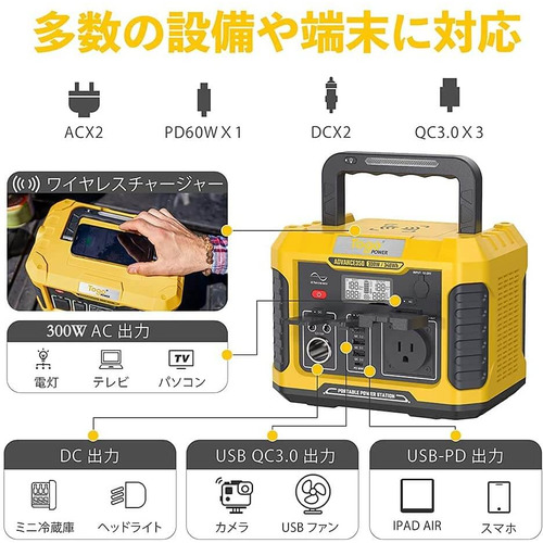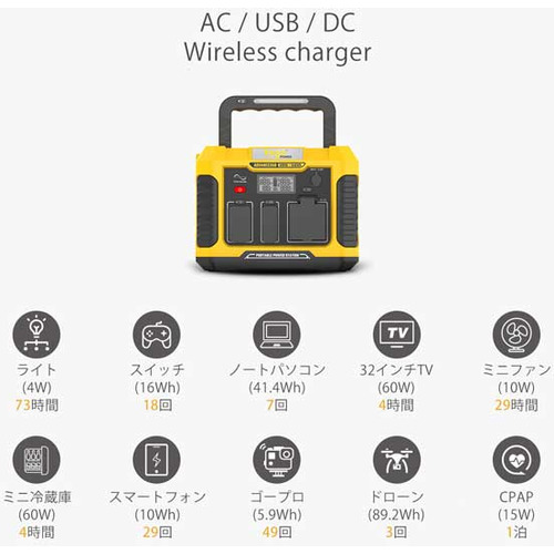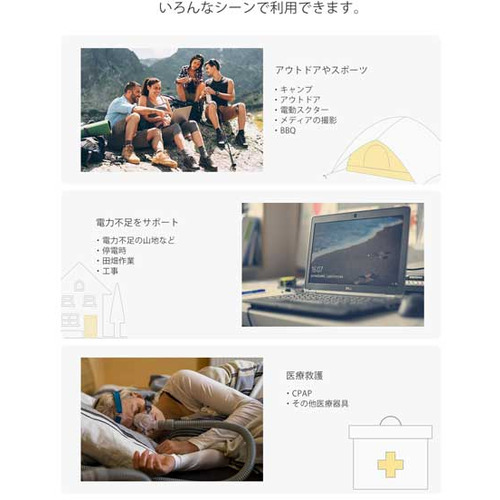 キャンプなどのアウトドアや工事、災害時、停電時などの電力不足をサポートします。