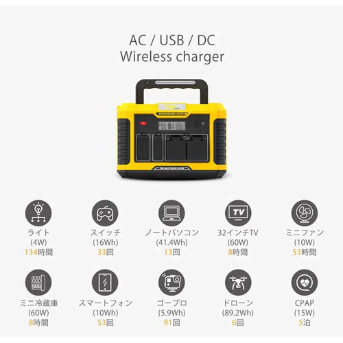 スマートフォン(10Wh)約53回、LED(4W)約134時間、ミニファン(10W)約53時間、パソコン(41.1Wh)約13回、小型冷蔵庫(60W)約9時間、32インチTV(60W)約9時間、ドローン(89.2Wh)約6回、ホットカーペット(300W)約2時間、電動ドライバー(500W)約1時間、同時出力10