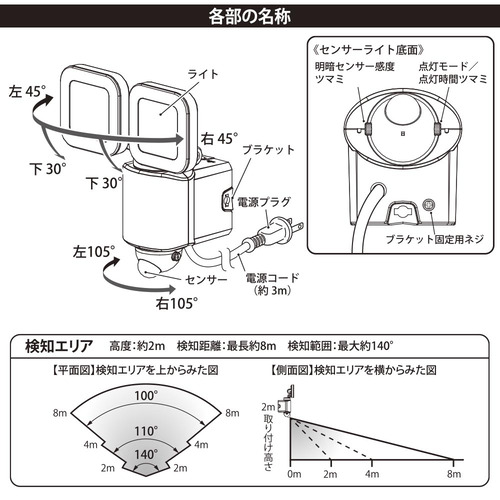 センサー:検知方式…焦電型赤外線センサー、検知範囲…最大約140°最長約8m(取り付け高さ約2mの場合)向き調節可能左右各105°