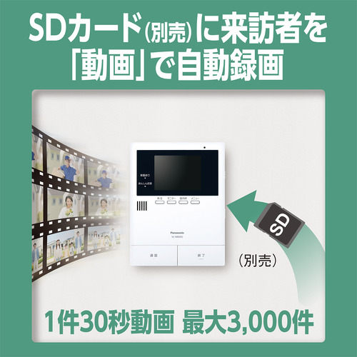 玄関子機:■品番 VL-V572AL-S ■電源 モニター親機より供給 ■使用環境条件 周囲温度:-10℃〜+50℃、湿度:90%以下 ■取付方法 露出型:JIS 1個用スイッチボックス適合 ■外観材質 難燃性PC/ABS樹脂(パネル部:難燃性ABS樹脂) ■最低被写体照度 1ルクス(カメラから約50cm以内) ■照明方法 LEDライト(照明用ランプ)