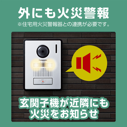 ・万が一火災が発生した際に、接続した住宅用火災警報器(※推奨機器として、パナソニック(株)エレクトリックワークス社製の移報接点アダプタSH3290K、SH3291の接続ができます。このアダプタで連動型の住宅用火災警報器を最大14台まで接続できます。また、移報接点付き住宅用火災警報器の接続もできます。接続可能な機種は各メーカーにお問い合わせください。※)と連動して、宅内のモニター親機や屋外のカメラ玄関子機が警報音などで通知して近隣にお知らせすることができます。