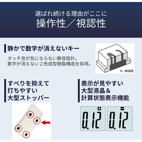優れた早打ち対応設計、操作性、視認性など、ひとクラス上の性能が業務を強力にサポートします。検算タイプ。12桁表示。