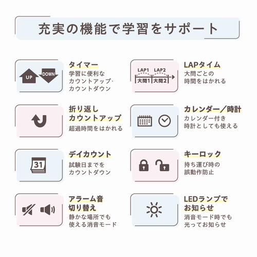 小さくて軽量で気軽に持ち運べるため、自宅だけでなく、予備校や学校での使用もおすすめです。消音モード搭載で静かな図書館や自習室でも周りを気にせずに使えます。消音モード時はLEDランプでお知らせいたします。