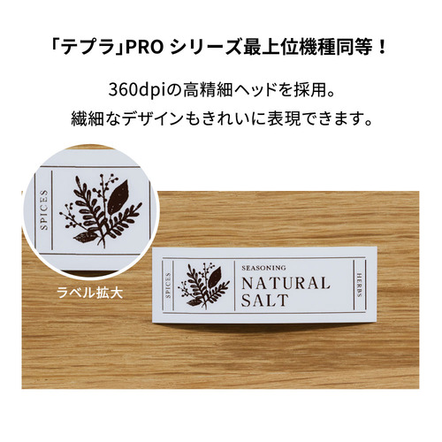 本体に搭載されている印刷ヘッドは「テプラ」PRO最上位機種同等の360dpiの高精細ヘッドを採用しています。細い線や曲面もなめらかに再現するので繊細なデザインの印刷が可能です。手書きのイラストやオリジナルステッカー風のデザインなどもきれいに印刷でき使い方が広がります。