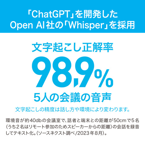 「ChatGPT」を開発したOpen AI社の音声認識モデルを採用。常に最適な音声認識エンジンで、高い文字起こし精度を実現しています。