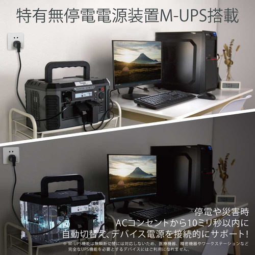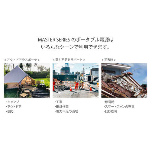 家庭内コンセントからMaster経由して給電時、内蔵バッテリーではなく、特製インバーターを経由してデバイスへ給電しますので、バッテリー電力を消費することなく、満タンの状態でデバイス電源を確保できます。台風、地震や津波などによる停電発生時、わずか10ミリ秒以内にMaster電源へ自動的に切替え、デバイス電源を継続的にサポートします。※無瞬断切り替えには対応しておりませんので、医療機器、精密機器には対応しておりません。